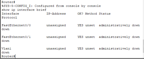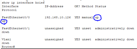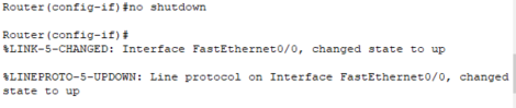 // FastEthernet0/0의 status와 protocol이 up으로 바뀐 것을 확인할 수 있다. 인터페이스가 활성화되어 있다는 의미이고 configuration 화면에서도 앞에 do 명령어를 붙여 do show ip interface brief로 확인할 수 있다