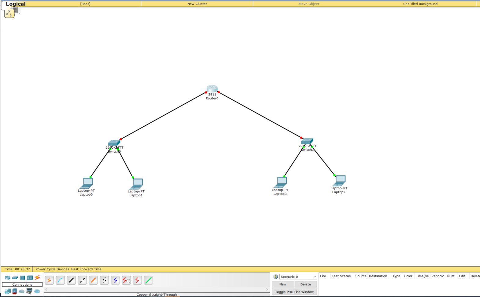 2811 router 1대, 2960 Switch 2대, 랩탑 4대, Copper Straight-Through