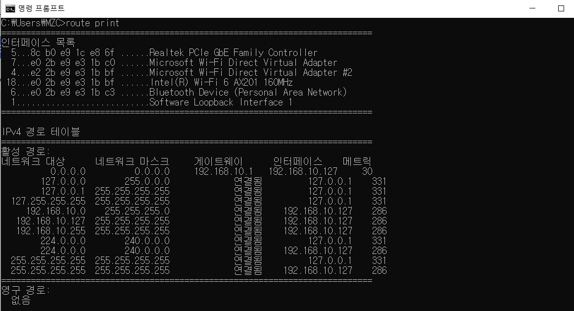 route print를 이용하여 라우팅 테이블을 확인할 수 있다