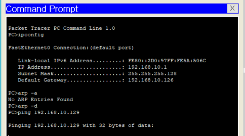 랩탑 1을 클릭하여 Command Line에 ping 192.168.10.129를 입력하여 랩탑 4에 대한 ARP를 먼저 수행