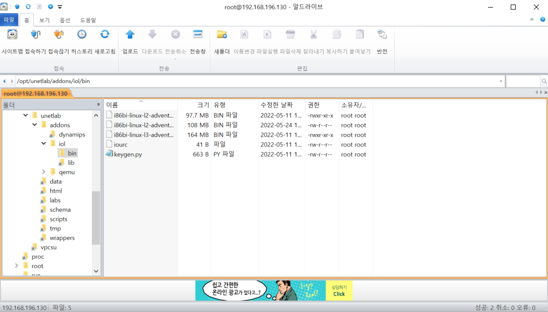 /opt/unetlab/addons/iol/bin의 모습