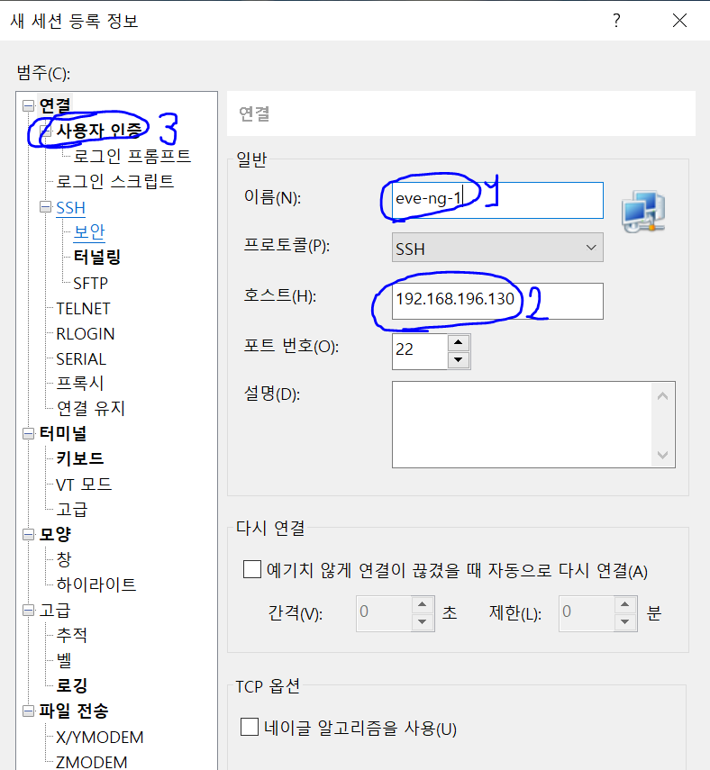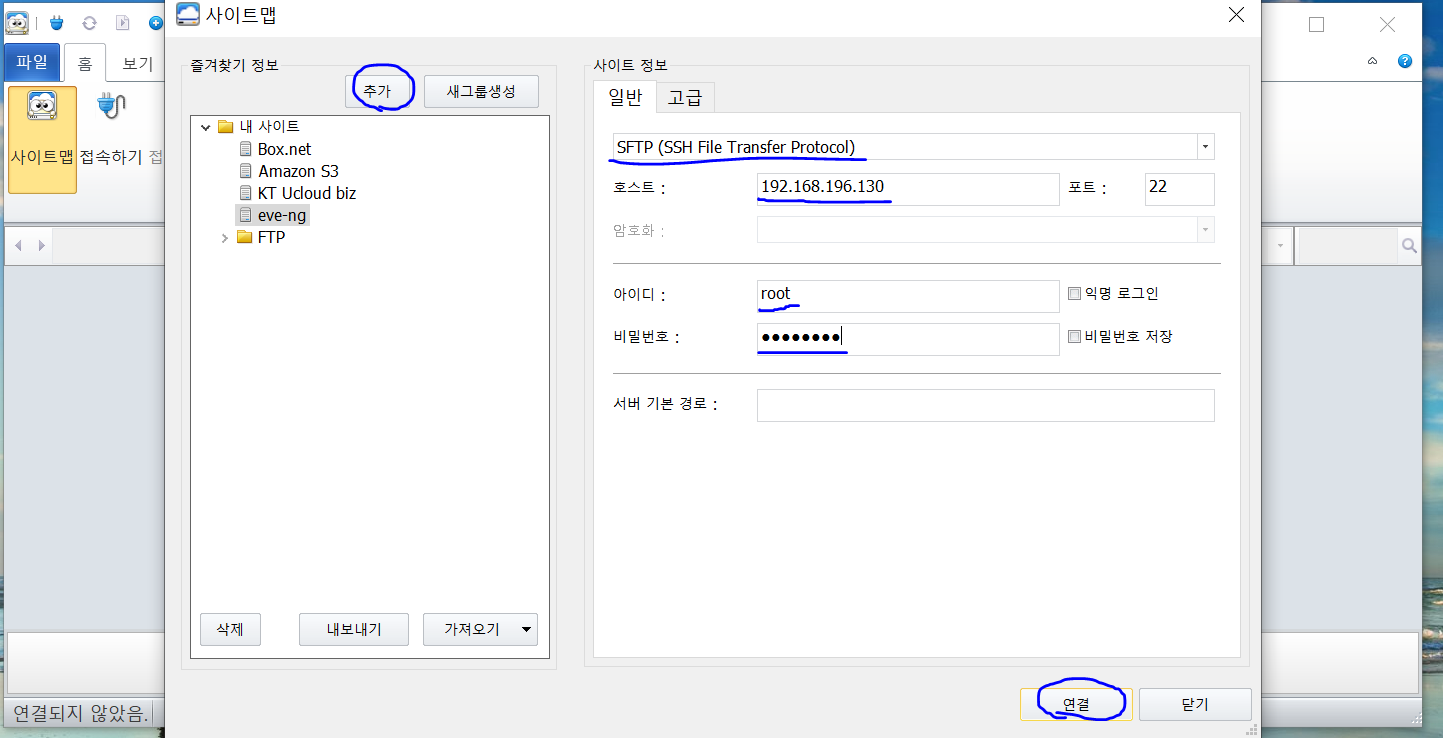 이름은 각자 알아서 적어주시고 호스트는 본인의 EVE-NG IP주소를 적어주세요