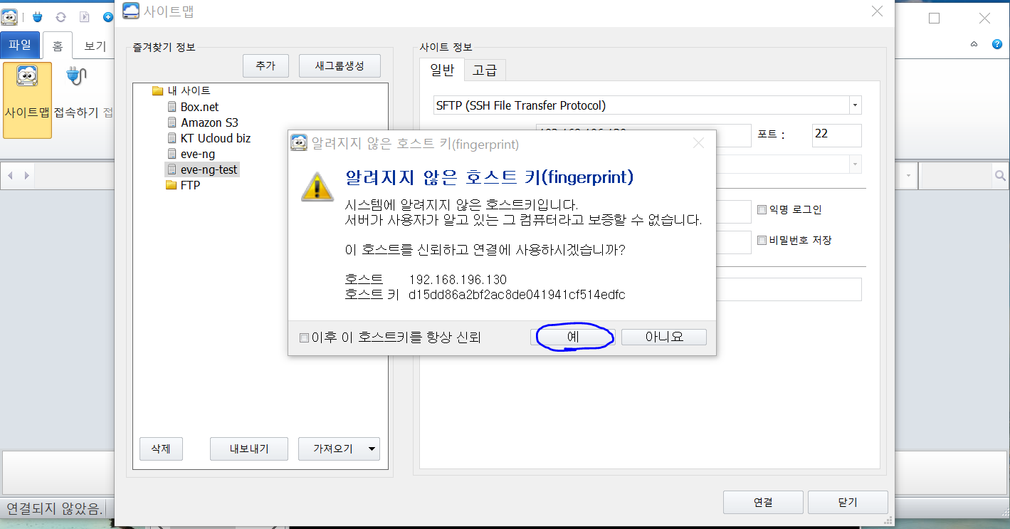 알려지지 않은 호스트 키라는 창이 뜨는데 예를 눌러줍니다