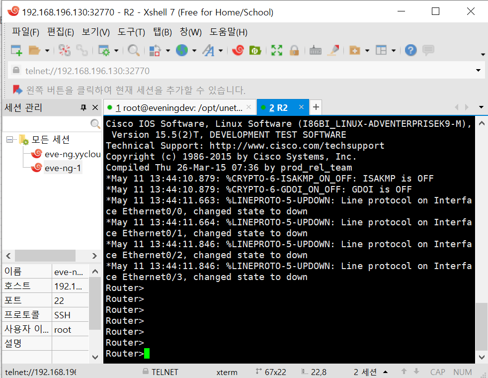 Xshell로 라우터 장비 Configuration을 진행할 수 있도록 콘솔에 접속하였습니다