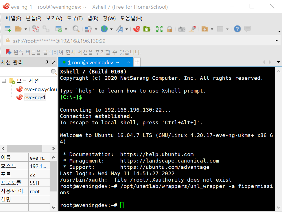정상적으로 XShell 터미널로 접속이 된 모습입니다