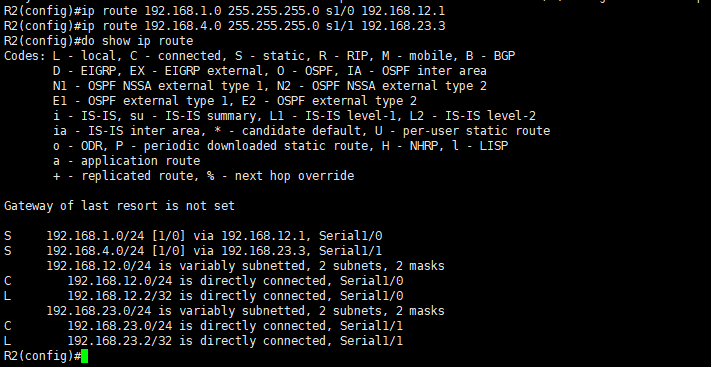 ip route 192.168.23.0 255.255.255.0 s1/0 192.168.12.2