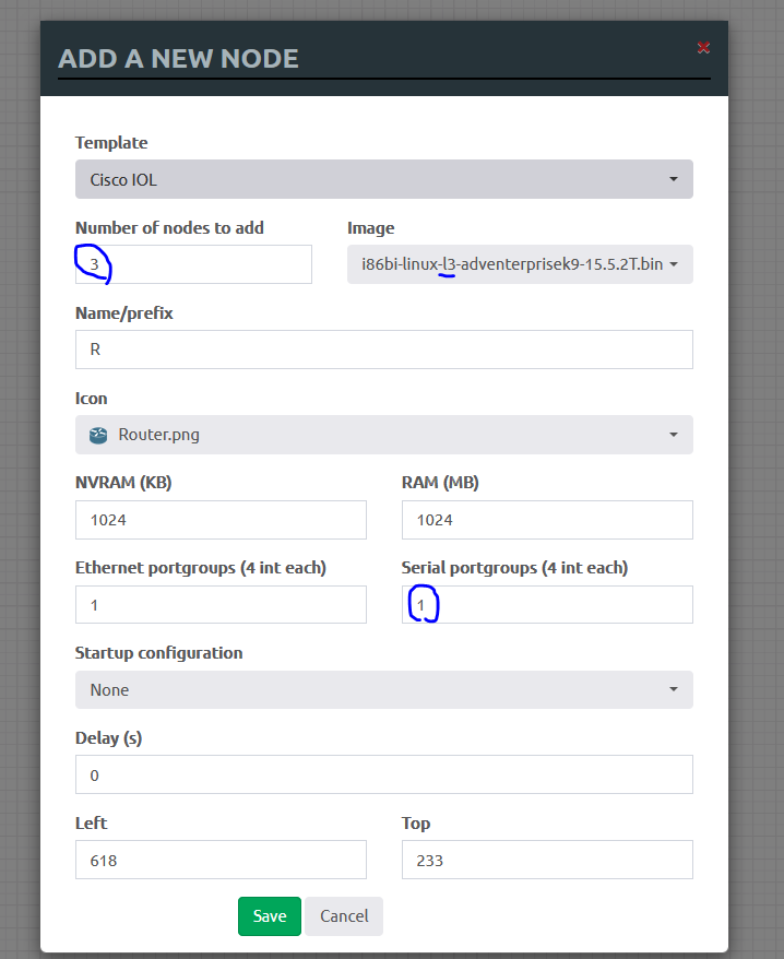 라우터 3대, 이미지는 L3, Serial port는 1 추가 후 [Save]