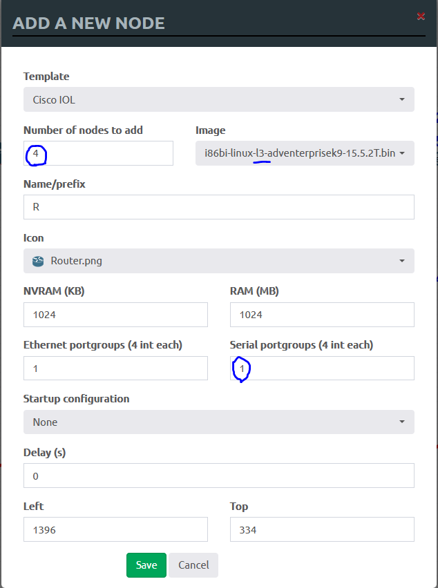 라우터 4대, 이미지는 L3, Serial port는 1 추가 후 [Save]
