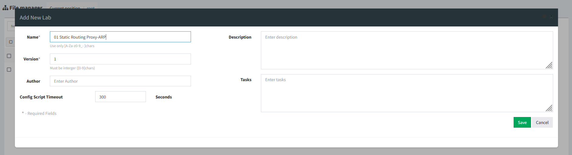 EVE-NG [add new lab]을 클릭하여 01 Static Routing Proxy-ARP로 Lab 이름 설정 [Save]