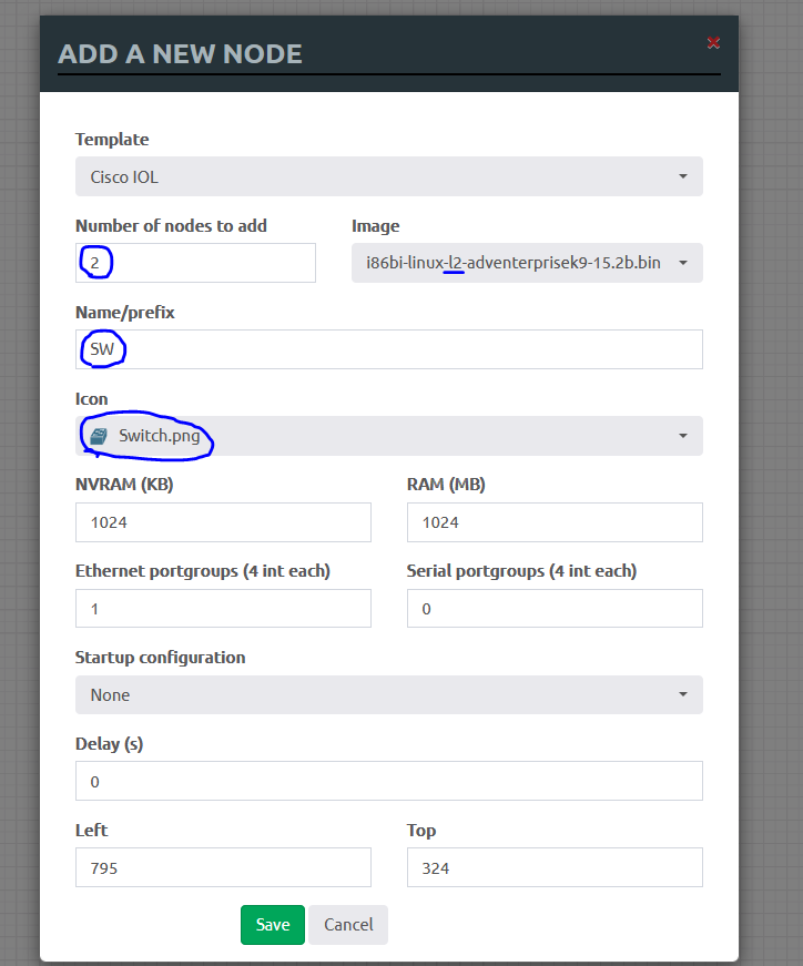 2대, 장비 이미지는 l2, 이름은 SW, 아이콘은 Switch로 바꿔준 후 [Save]