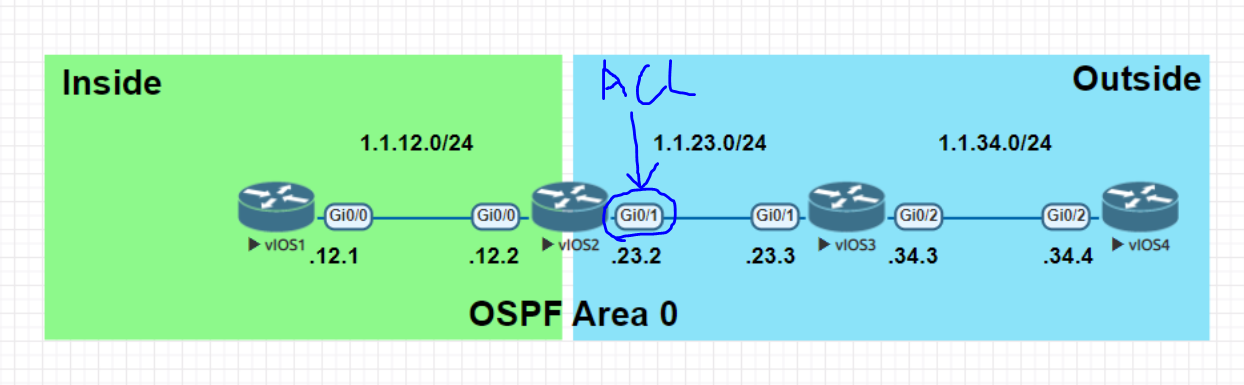 다음과 같이 Gi0/1 포트에 ACL, CBAC를 적용하여 vIOS4에서 vIOS1로 가는 패킷에 대해 허가 및 거부를 해보자