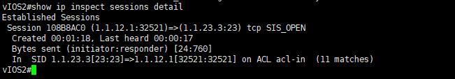 vIOS2에서 확인해보면 내부망인 1.1.12.1에서 외부망인 1.1.23.3으로 전송된 telnet 패킷이 돌아올 때 허용하는 임시 ACL이 만들어져 있고, 이것으로 인해서 vIOS1에서 vIOS3로 갔다가 돌아오는 telnet 패킷이 허용된다.