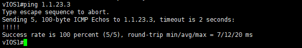 vIOS에서 외부망인 1.1.23.3으로 ping을 보내는 모습