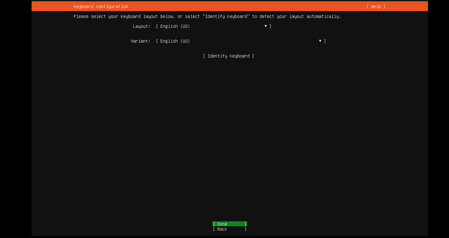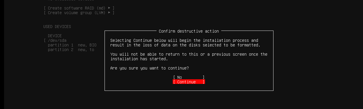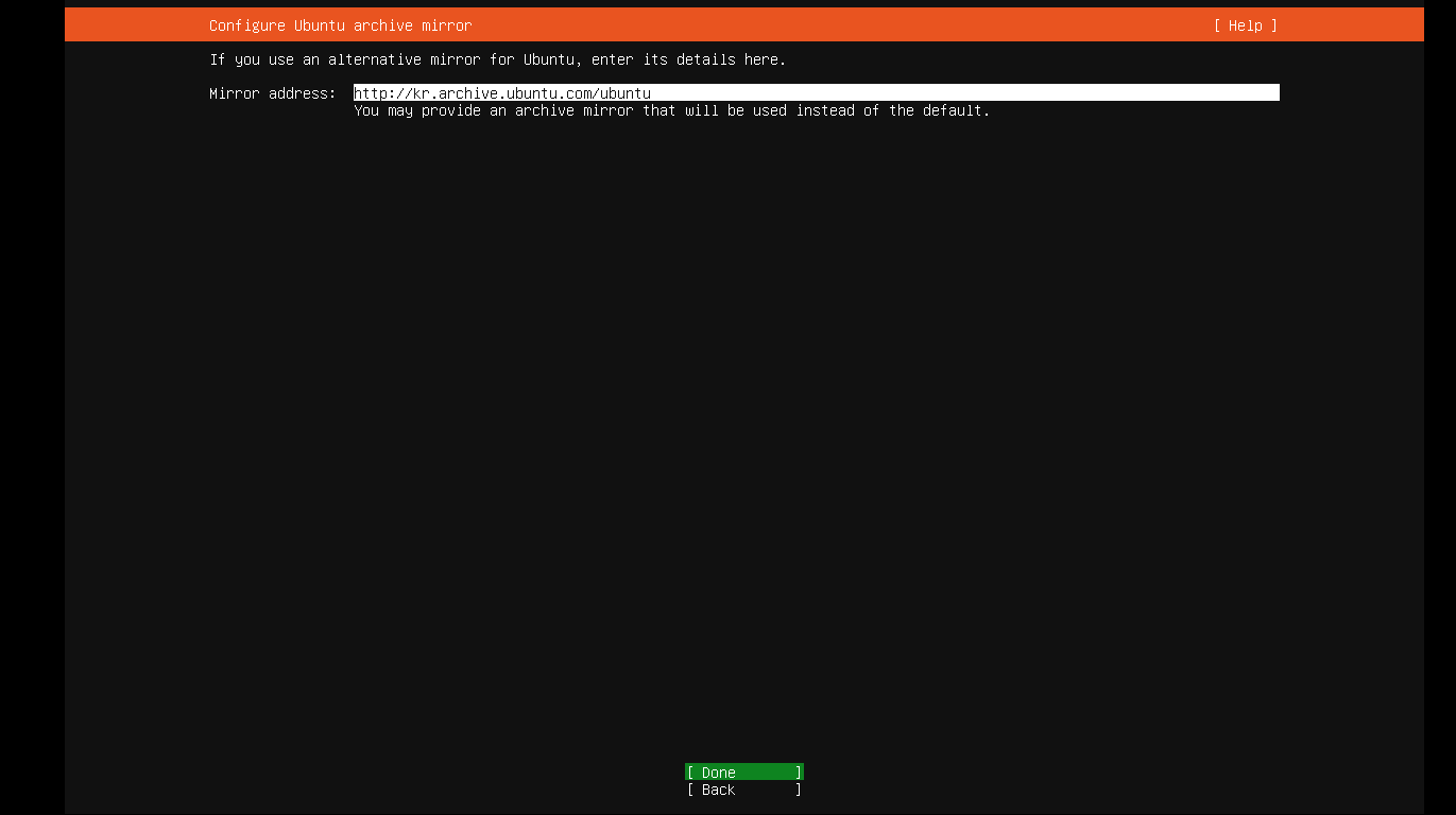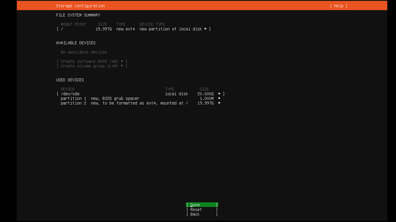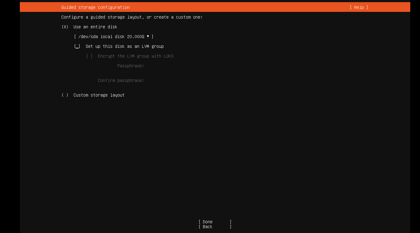 Guided storage configuration - [Set up this disk as an LVM group] 체크 해제 - [Done]