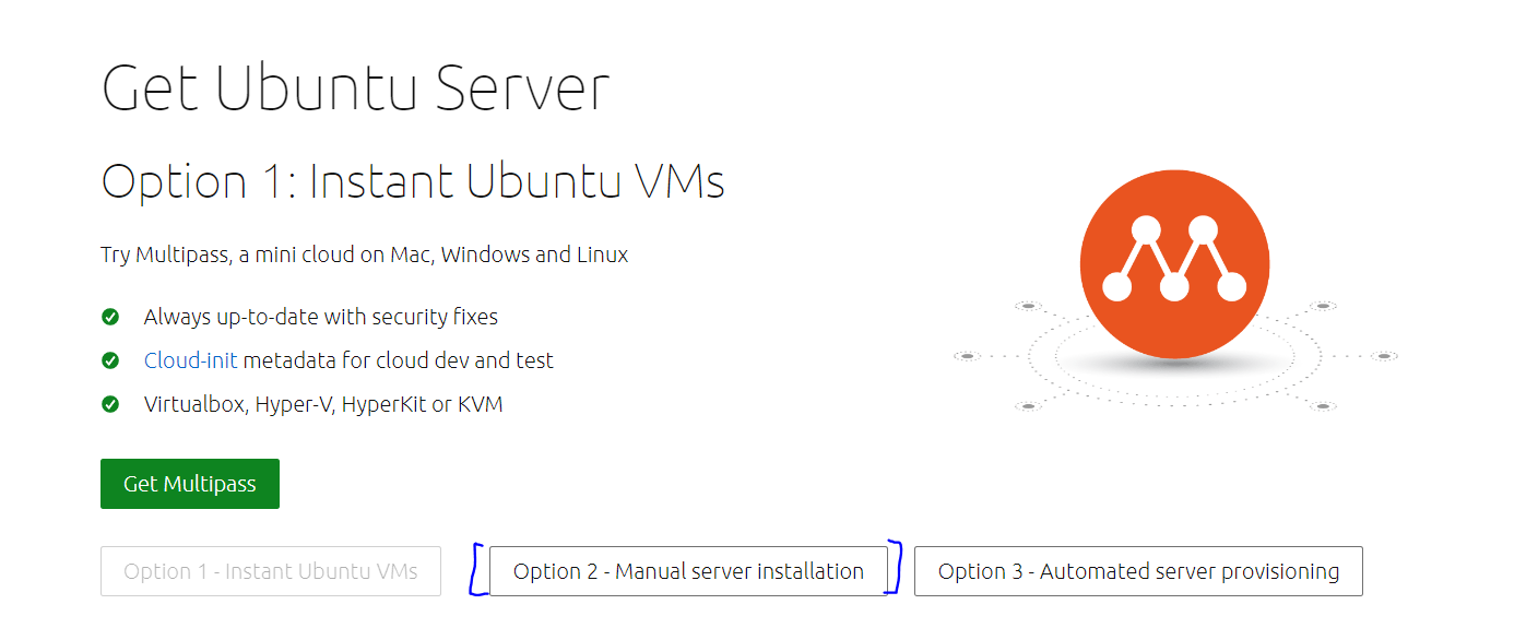 Get Ubuntu Server one of three ways; by using Multipass on your desktop, using MAAS to provision machines in your data centre or installing it directly on a server.