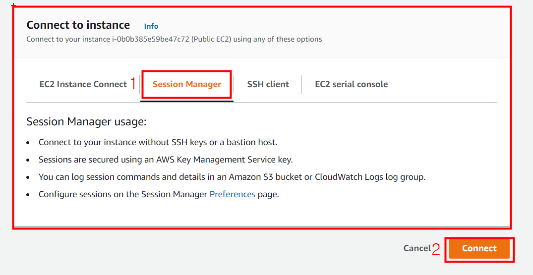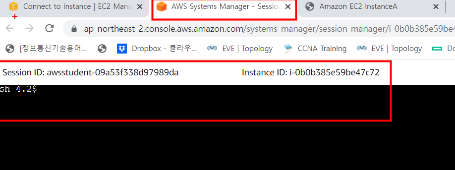 출력 내용입니다. 세션 관리자를 사용하여 퍼블릭 인스턴스에 연결했습니다.