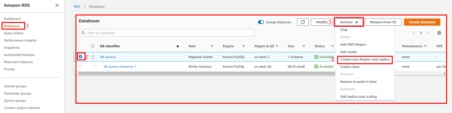 RDS 데이터베이스 교차 리전 복제본을 생성했습니다.