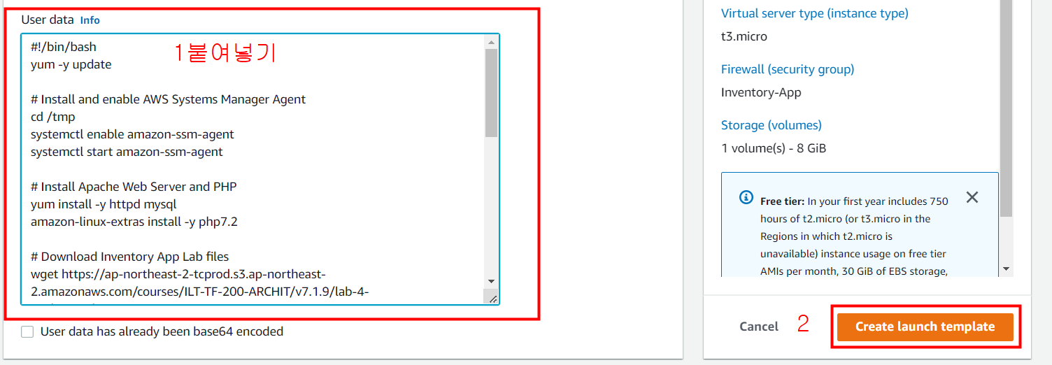 다시 템플릿 생성 페이지로 돌아와 User data를 붙여 넣은 후 생성하기를 누릅니다.