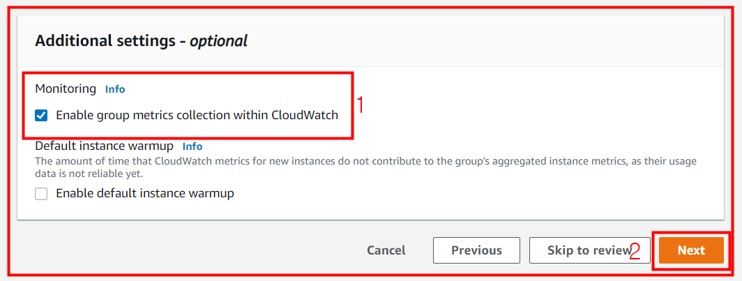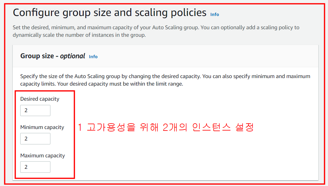 고가용성을 위해 Min, Max capacity를 2개로 인스턴스를 설정합니다.