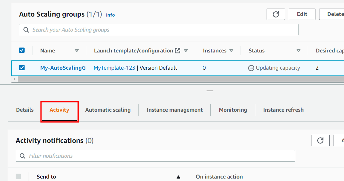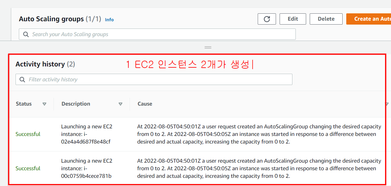 오토 스케일링 그룹이 EC2 인스턴스 2개를 자동으로 생성한 모습을 history에서 확인할 수 있습니다.
