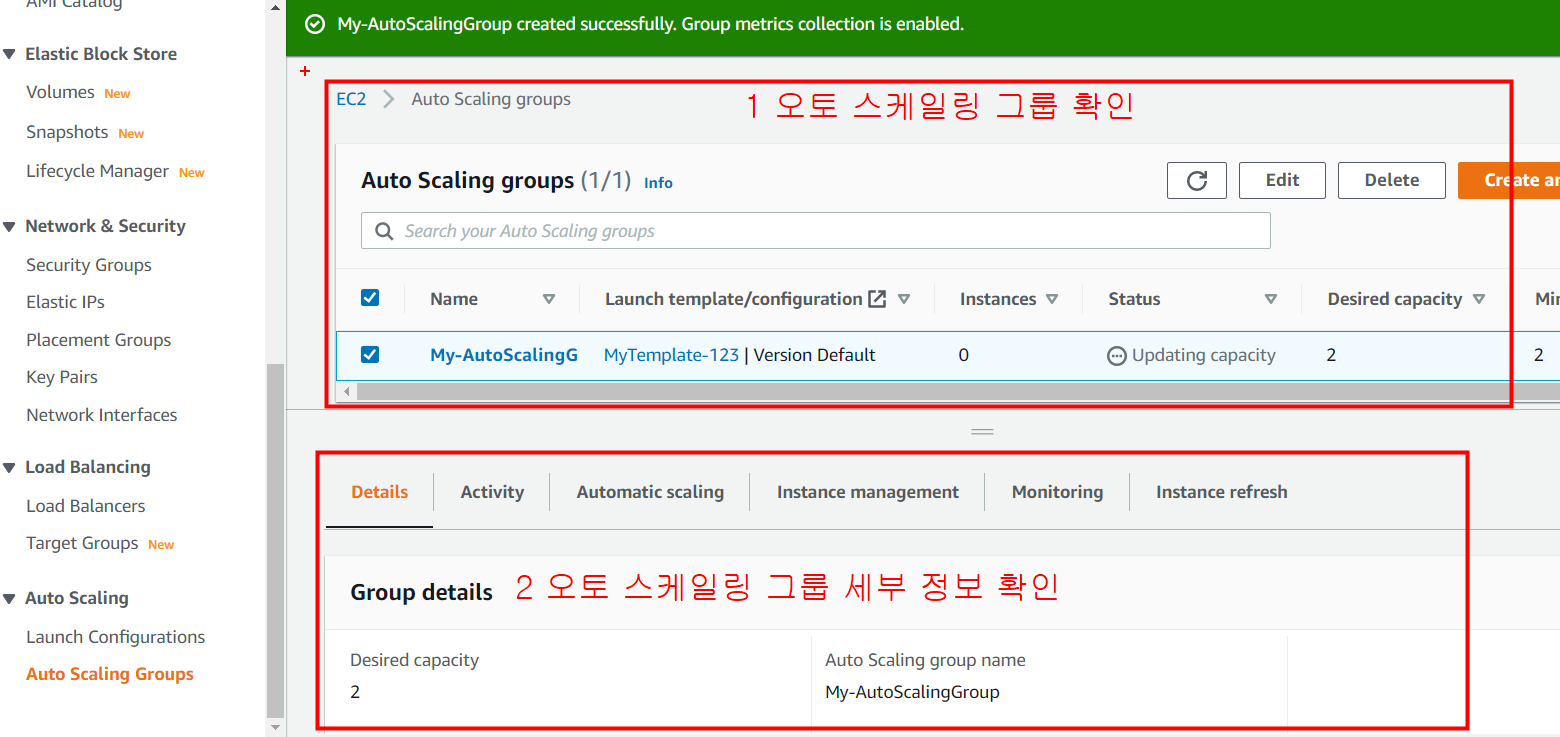 오토 스케일링 그룹과 세부 정보를 확인합니다.