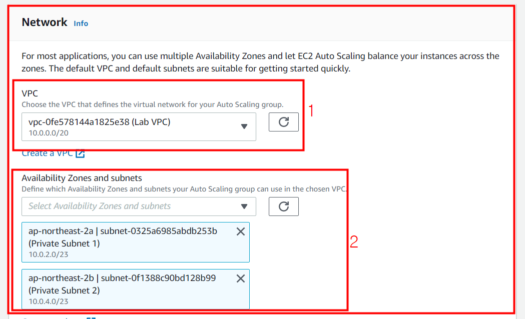 오토 스케일링 그룹에 Private 1, 2를 추가해 그룹을 만듭니다.