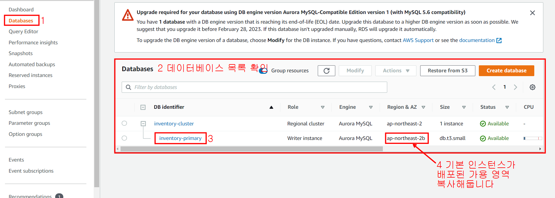 primary로 표시된 데이터베이스의 Region & AZ 값을 복사해둡니다.