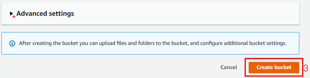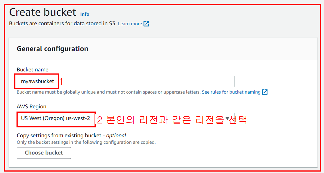 나머지 구성은 그대로 두고 bucket을 생성합니다. Bucket 이름이 중복이라면 중복되지 않은 고유한 값을 넣어주세요.