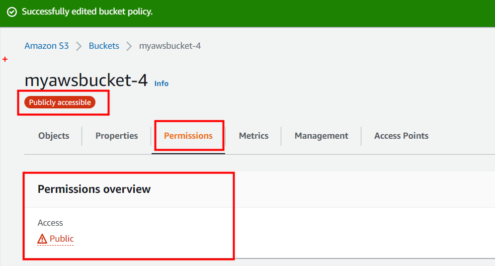 다음과 같이 경고 메세지가 뜨는데 현재 적용된 정책이 퍼블릭 액세스가 가능하다는 것을 알려주는 메세지입니다.