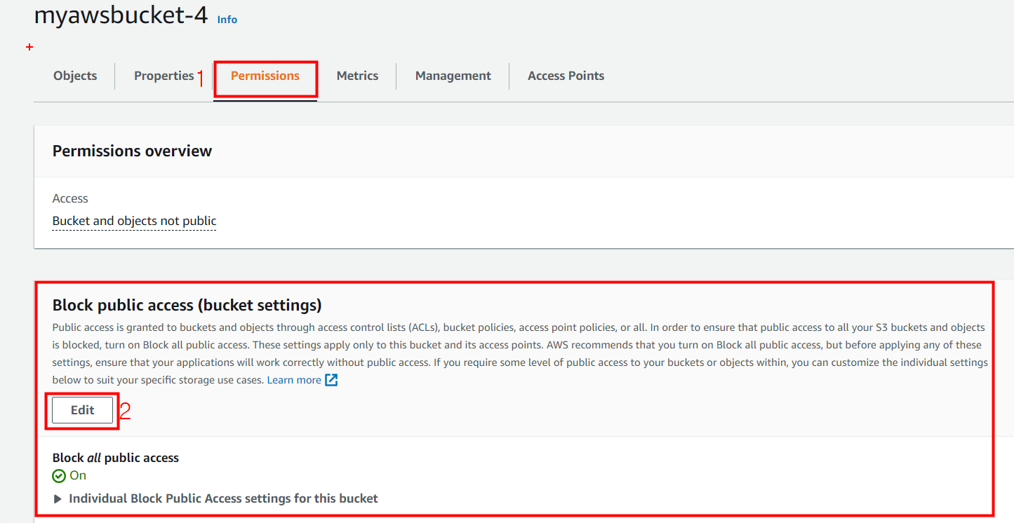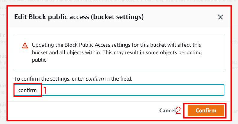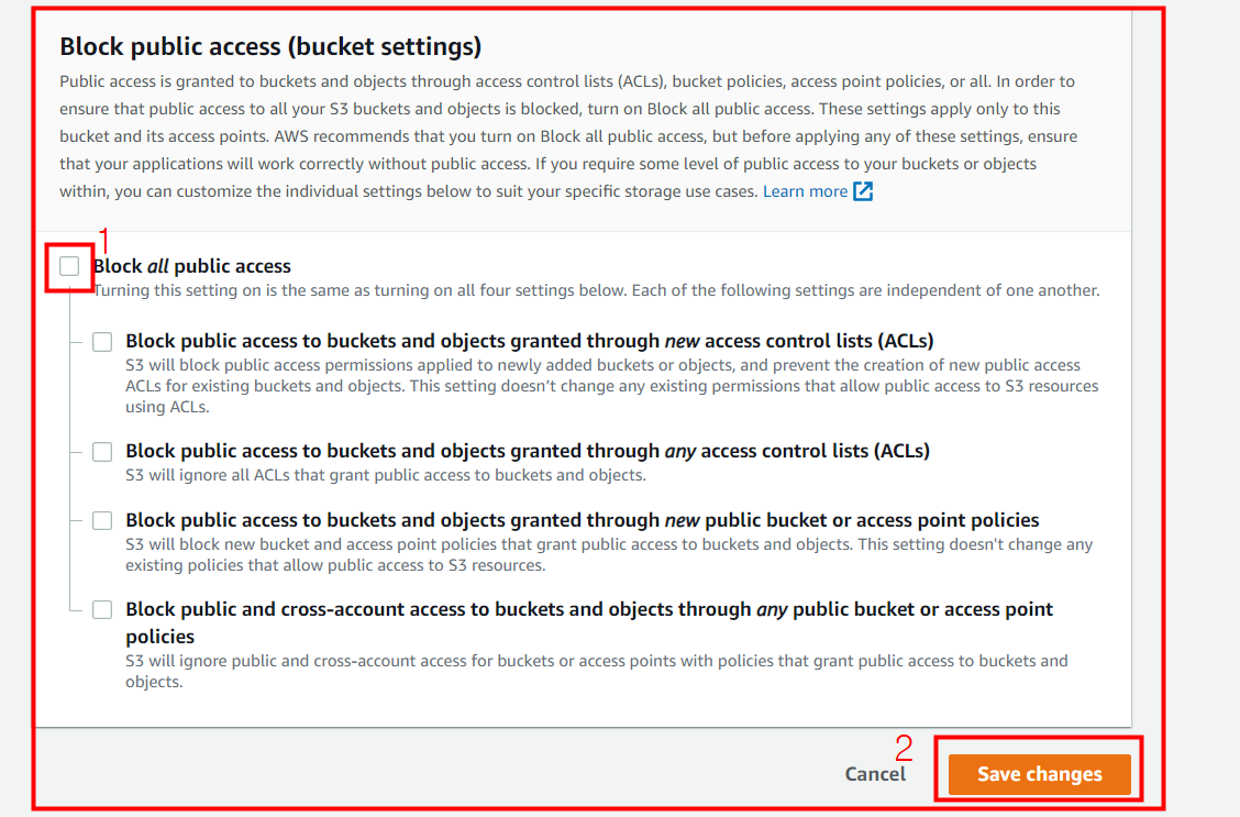 퍼블릭 정책을 생성할 수 있도록 Bucket 구성