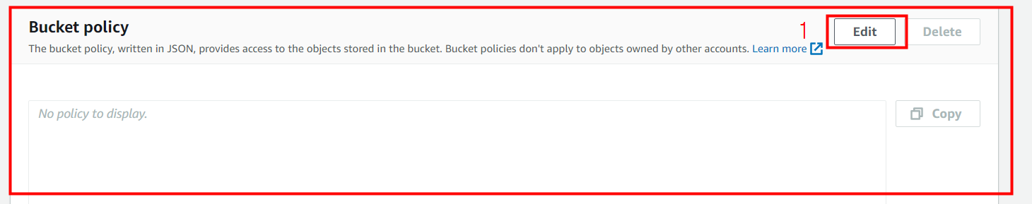 Permissions 탭에서 아래로 스크롤하면 Bucket policy가 보이는데 Edit을 눌러주세요.
