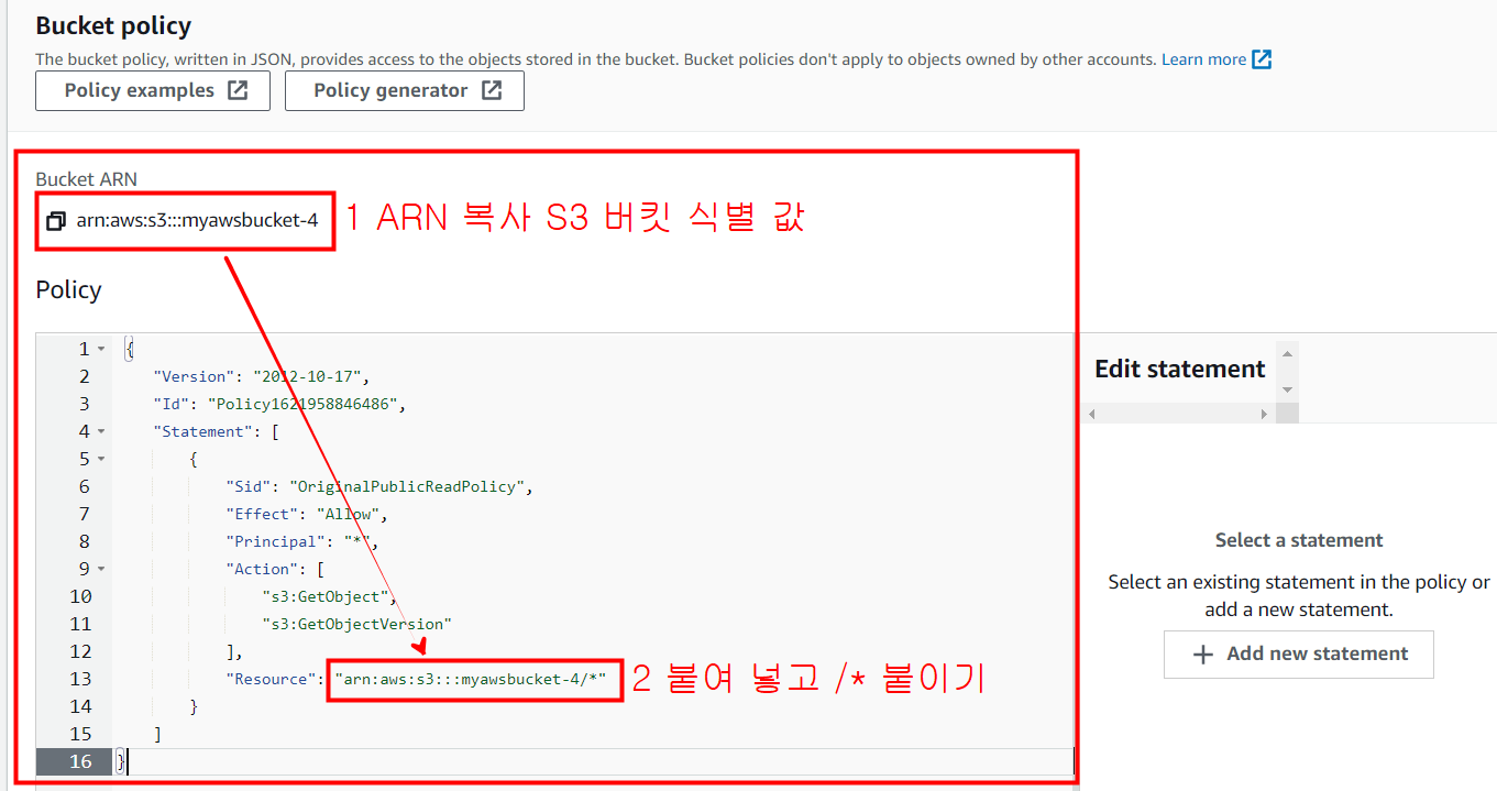 "Resource": "RESOURCE_ARN" //본인의 Bucket ARN 값으로 변경